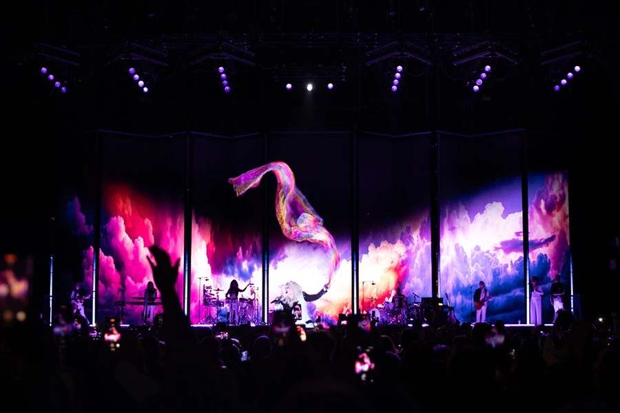 The show is an eclectic mix of bright colours (her true colours if you will) bringing Laupers iconic image into 2025, designed by Tom Sutherland and the team at DX7 Design; along with Brian Burke of Brian Burke Creative. The main event is a unique 'accordian-style' video screen lined with LED lighting fixtures, made up of 234 ROE Active CB5 video panels and surrounded by Pixel Line IP fixtures. To support the fixtures and create the seamless columns between the panels, PRG adapted the custom metalwork from the US tour as well as fabricating new metalwork to support pixel line “chevrons” that sat on the front of the on-stage lighting trusses.