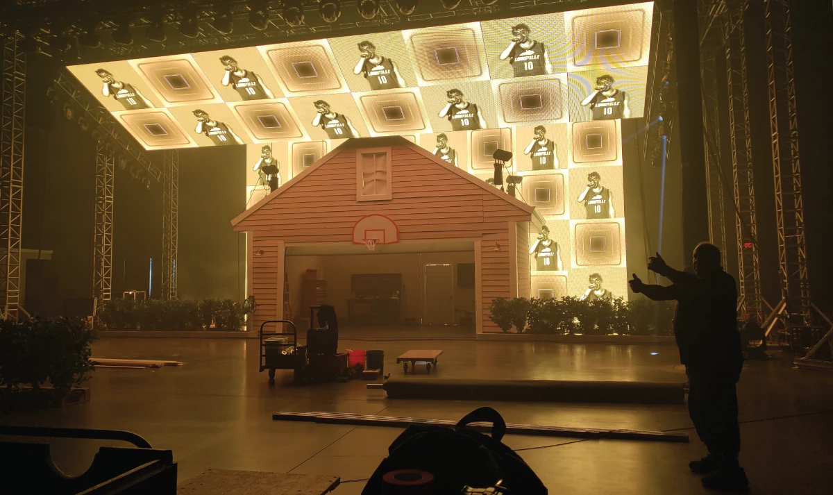 VIDEOThe show played out like a classic rap show for the first act, with Harlow as the singular performer. Video skits, created by the WastedPotential team, moved the plot along, threading the Midwest homecoming narrative and leading to the big reveal: an automated 20 ft LED wall that was previously acting as a backdrop pulled up like a garage door, revealing a full band. It felt like band practice, with NBA posters and jerseys adorning the walls of the garage set. “Knowing that we had a band coming was a big part of the design process, because Jack has never toured with a band before,” explained Fellers. “He wanted to introduce it in a really unique way and integrate them aesthetically, so putting them inside of a garage worked perfectly.” Integral to the plot and the aesthetic, video components drive the show forward. The LED garage door, which is made to be as light and strong as possible with PRG’s proprietary SpaceFrame®, acts as a canvas in its upright, revealed position. At certain moments in the show, projectors mapped visuals onto the garage. At other points, lighting was used with gobos and prisms to create a trippy, layered effect. The skits were filmed in Harlow’s hometown of Louisville, KY, and have a cinematic feeling. The first features Harlow driving in the desert in an old hatchback with a bunch of suitcases and equipment. He drives past a sign that says, ‘Come Home the Kids Miss You’. The show featured three cameras: one FOH long lens, and two handhelds in the pit, operated by Cole Peterson and Dana Jenkins. “Jack Harlow has a really strong fan base who know all the lyrics to his songs and always have creative signs, so finding enthusiastic and strong crowd shots is fairly easy,” explained Video Director Marie-Frederique Opsomer. Because the IMAG screens couldn’t fit into smaller venues, Opsomer adapted the show by adding the camera feed to the screens for more songs and using the ceiling wall as an IMAG for select sequences where Jack interacts with the crowd and props including a basketball hoop and a working garden hose that he playfully sprays the audience with. All Notch effects were made by Engineer Collin Wilkey. He worked on the effects daily to get them in line with the creative team’s vision. The effects were used on the camera feed that was displayed on the screen, as well as on the IMAGs. “Colin is very talented and passionate about Notch and d3 and that was clearly visible in his work,” said Opsomer. FAMILY FEELING During production rehearsals, Jack introduced himself personally to every crew member, fostering a feeling of closeness within the touring team. “It is very rare for an artist to do that, and it was much appreciated by everyone. It made it easier to feel comfortable and go to higher ups with questions or concerns,” said Opsomer. The benefits of working with the same team consistently was mentioned by both Fellers and Brooke Hershey, PRG Account Executive who has worked with WastedPotential for years. “It’s already a dream to work in this industry but doing it with an artist and group of people who are this authentic takes it to the next level,” Hershey said. “With all the long days and nights, feeling at home on the road makes all the difference.”
