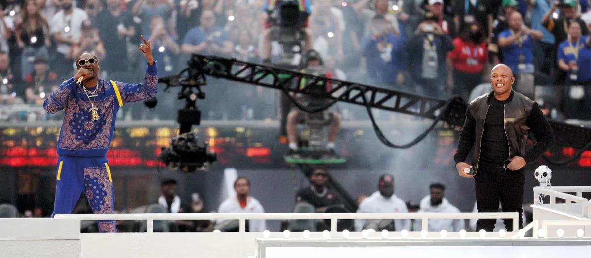 Snoop Dogg and Dr. Dre perform at the Pepsi Halftime Show.Halftime Cinematic Cameras, Engineering and Lighting