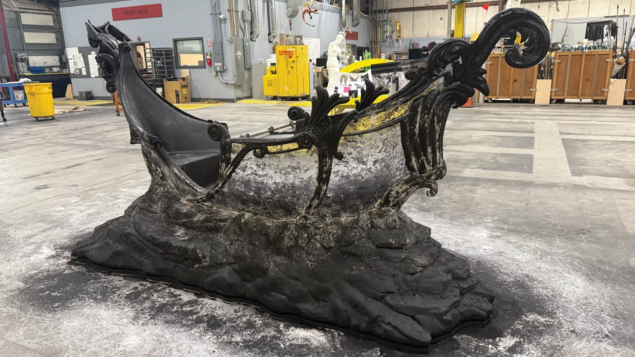 Scenic challenges also demanded innovative solutions. For the scene that takes place in the underground lake, a boat’s travel is tracked using a magnetic strip system. Peterson explains, “You can literally adhere the magnetic tape to the floor, and the tracking system’s laser eye follows that strip. The advantage of this over a traditional deck track is significant, if adjustments are needed in the boat's movement, you can simply peel up the tape and reattach it. The fundamental idea is that we can create our own tracking path without needing to install a deck and track.”