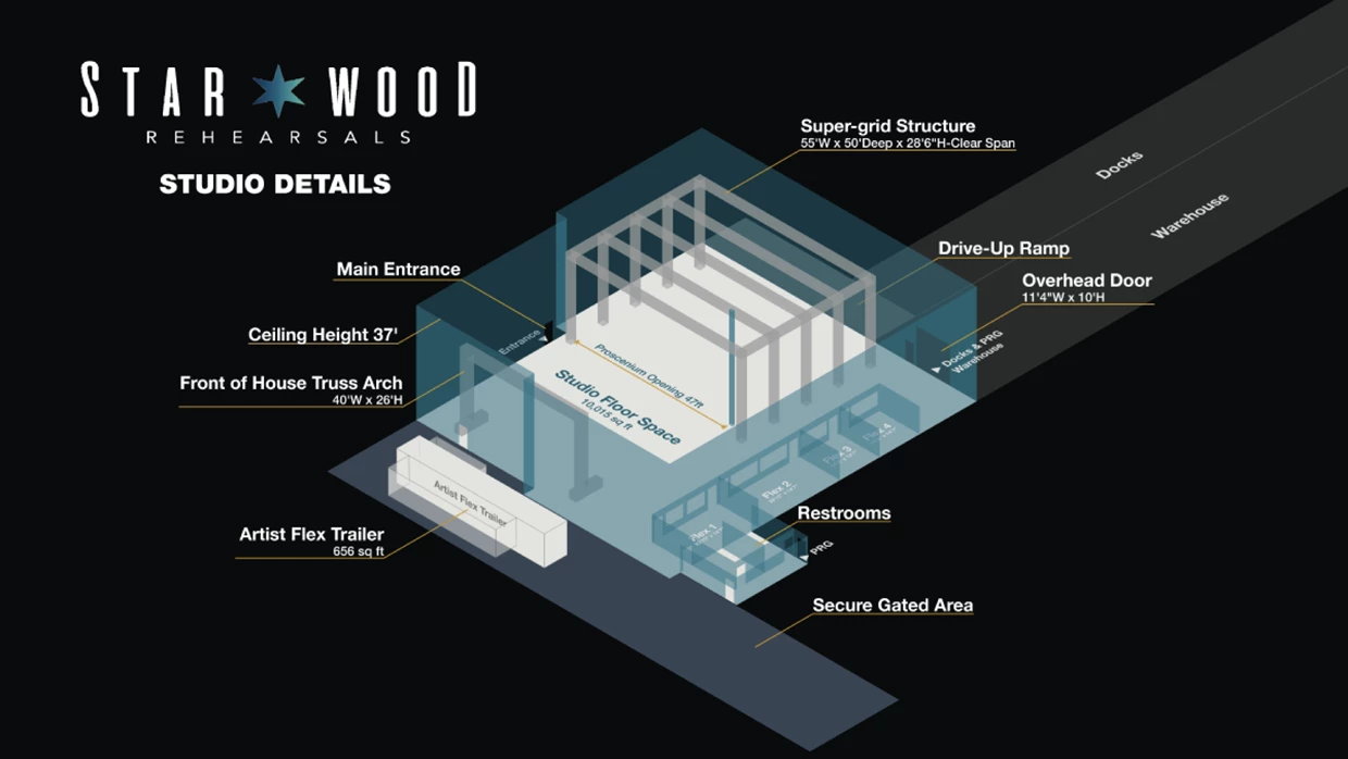 Located in PRG’s Nashville super depot, our rehearsal space has hosted artists like Dan + Shay, Florida-Georgia Line, Gryffin, Jack Harlow, and Kelsea Ballerini. Named in homage to the historic Starwood Amphitheatre, our facility honors Nashville's rich concert touring history.